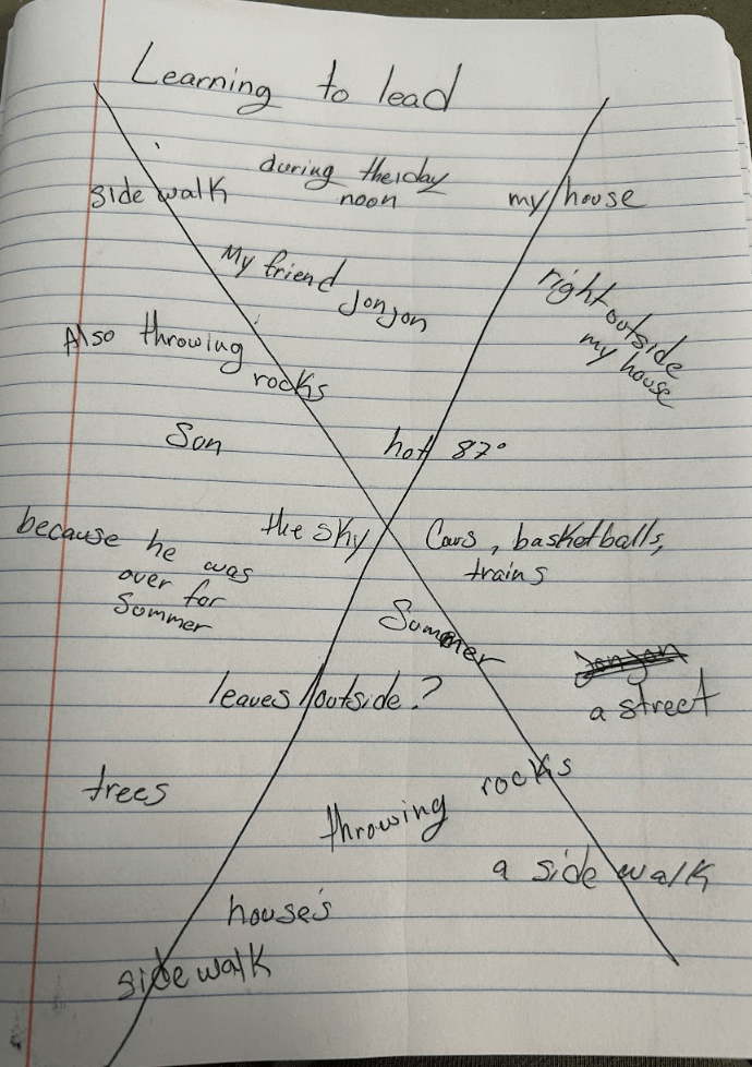 Because this is the same day as the X-page activity for their narratives, their choice of moment is already chosen, the childhood learning moment. We also discuss how these choices of clarity can relate to writing.