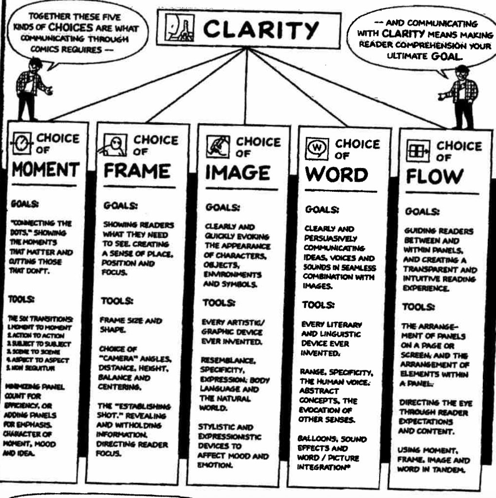 After the X-page activity, we discuss the first eleven pages of Scott McCloud’s chapter 1, “Writing With Pictures” from Making Comics. This chapter introduces students to McCloud’s five Choices of Clarity: choice of moment, choice of frame, choice of image, choice of word, and choice of flow (10). I place class copies of the Choices of Clarity and the Transitions on each table for students to reference as we discuss them (see below).