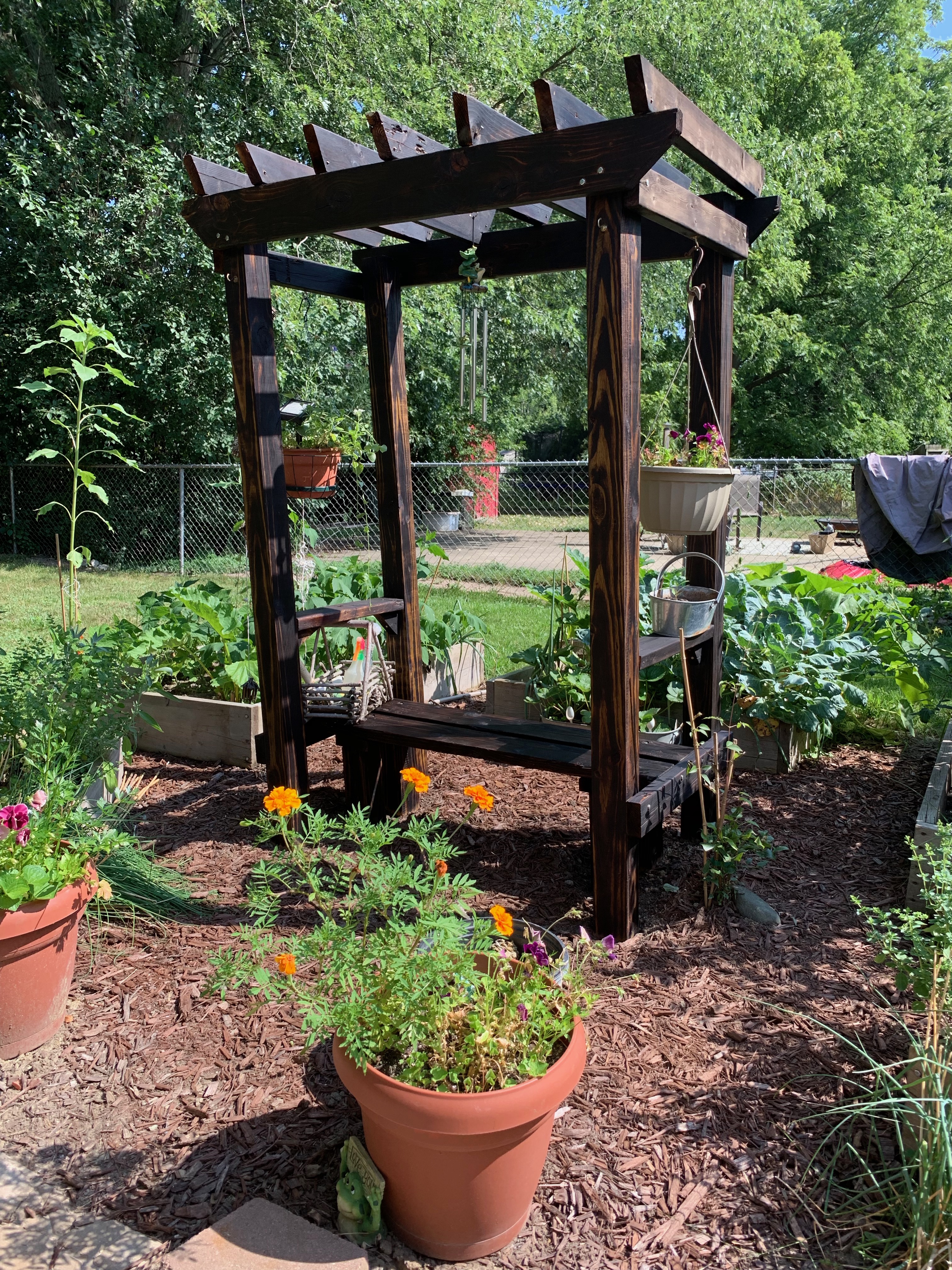 In May I built an arbor around the garden bench and used a Japanese wood burning technique to finish it, called shou sugi ban. I then sanded and applied linseed oil. It is supposed to last for many, many years.